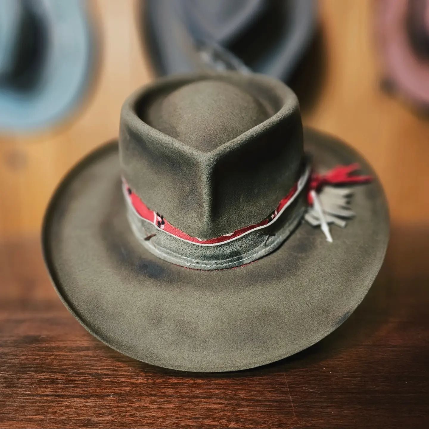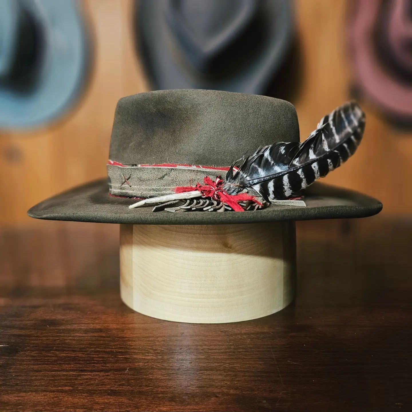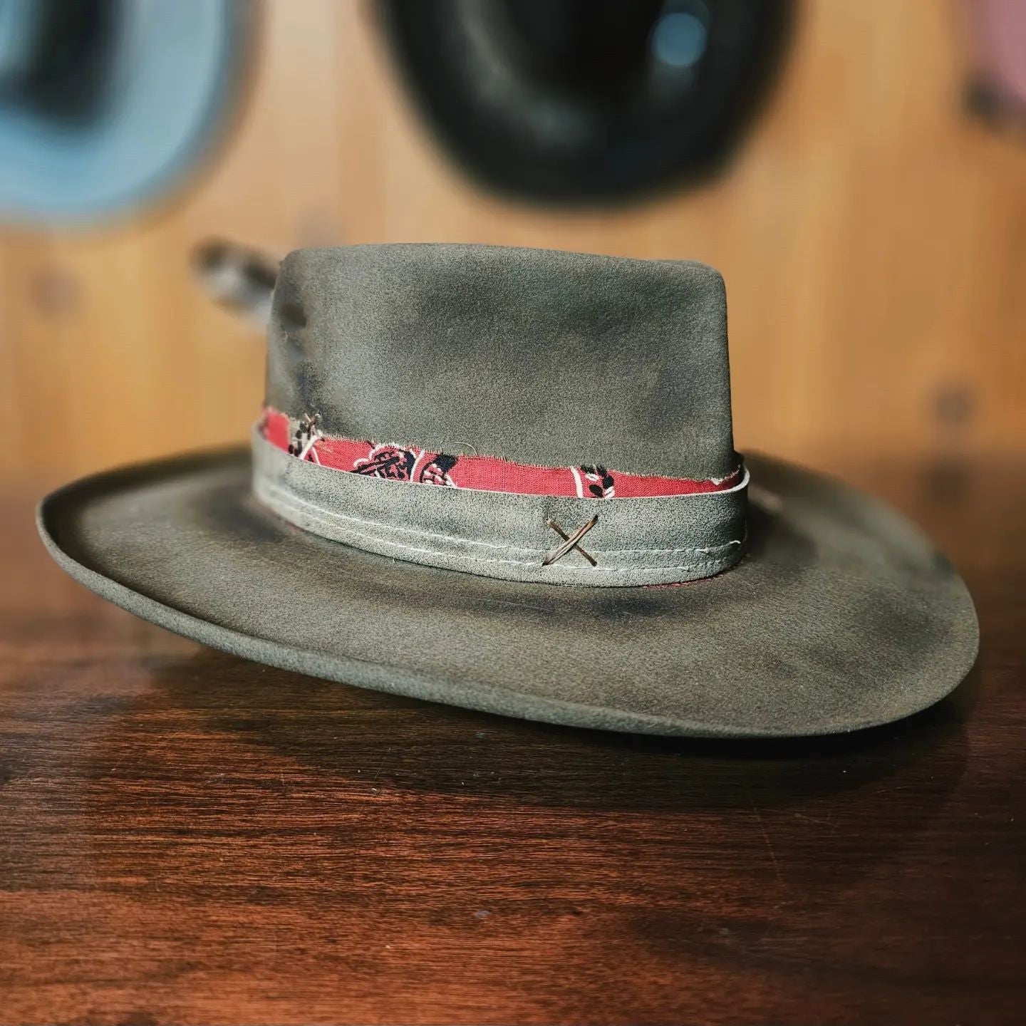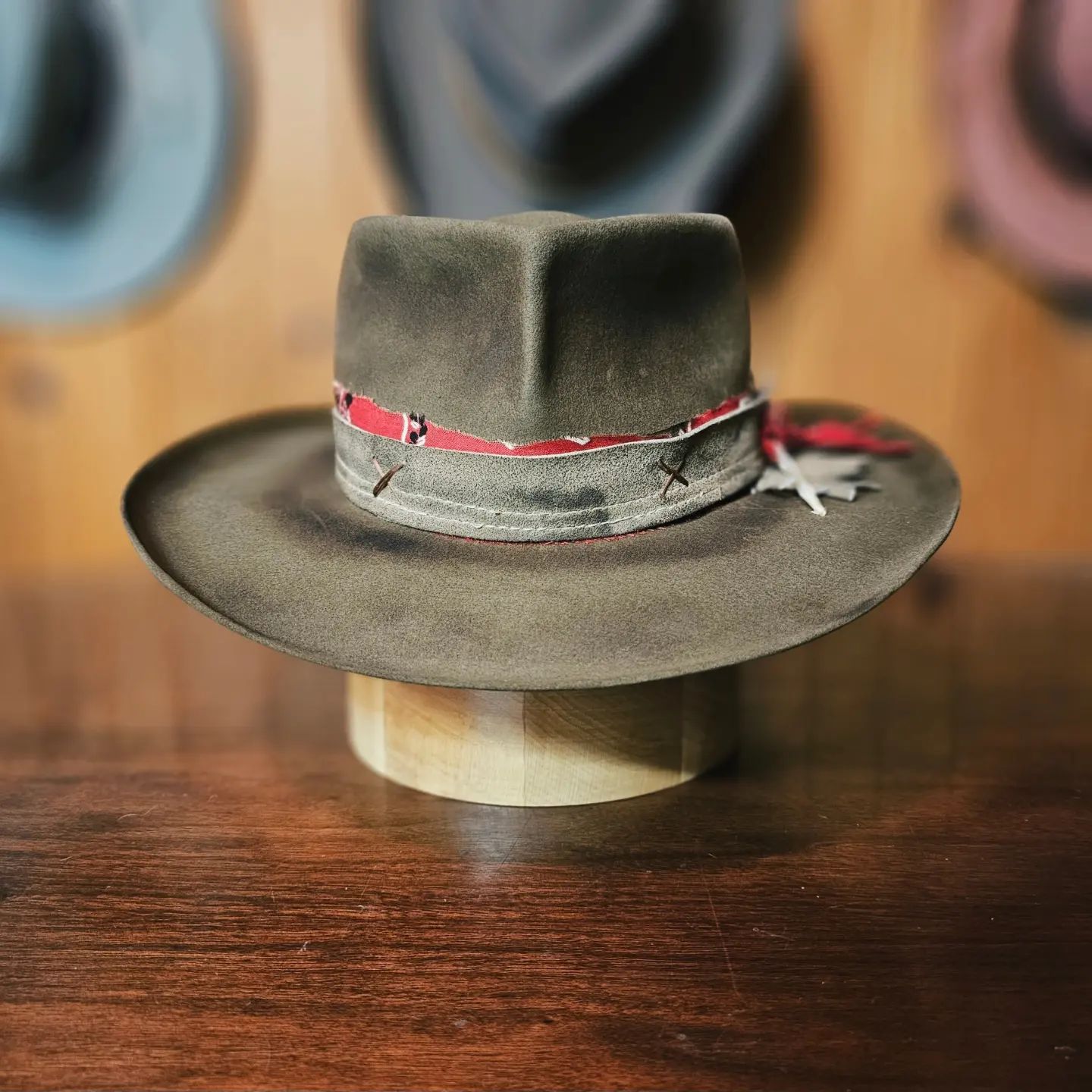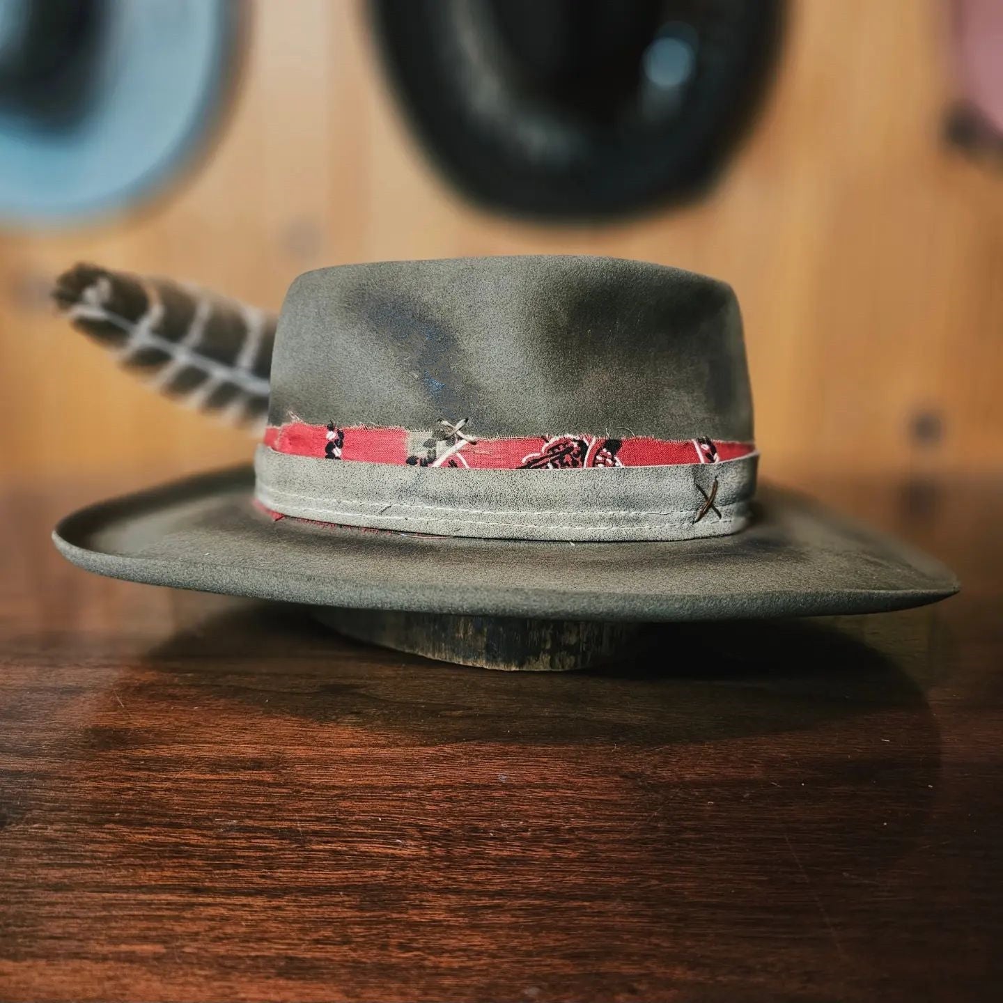 Don Williams style pinched-front crown with a flat, pencil-curled brim. The band is made from bandana fabtic and a piece of leather from some old chaps. Jeffrey wanted this lid to look beat up, like it's seen some $h!t. So I distressed it and added some stitches to the side of the crown.