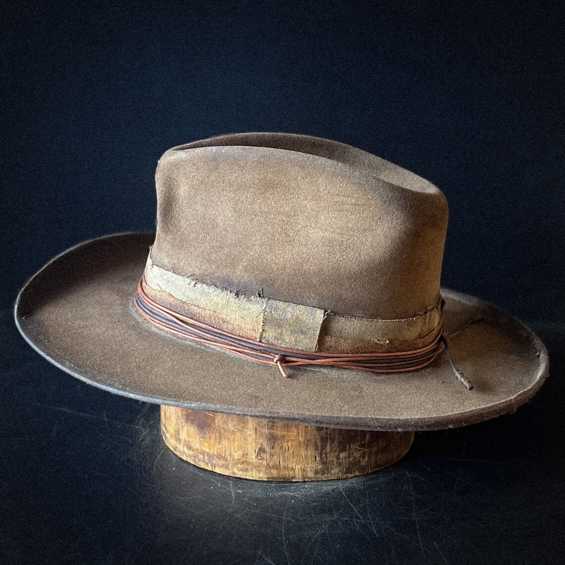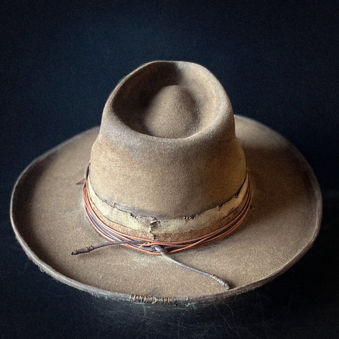 Distressed fabric band with multiple layers of leather cord. The inside has a comfortable leather sweatband with a satin liner.