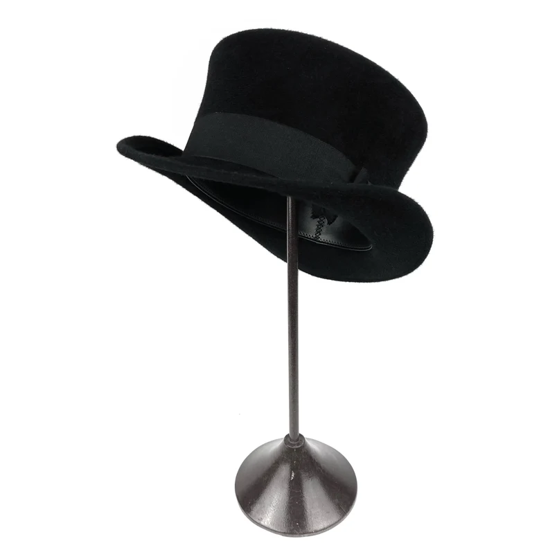 The top hat is a tall cylindrical hat, typically made of silk mounted on a felt base. It has a high crown, a narrow, slightly curved brim, and is often black.