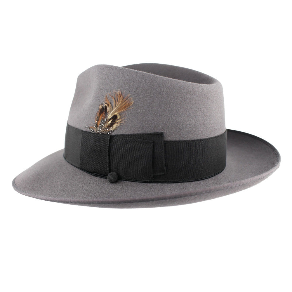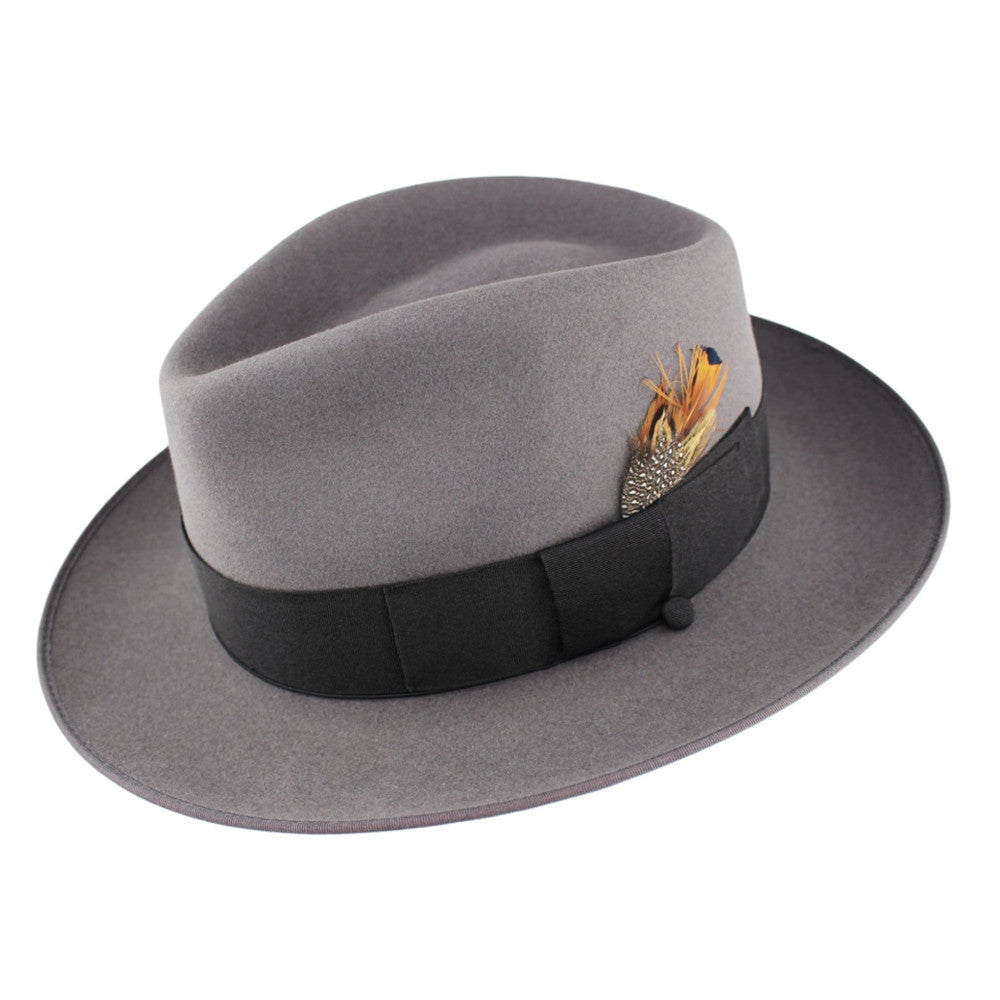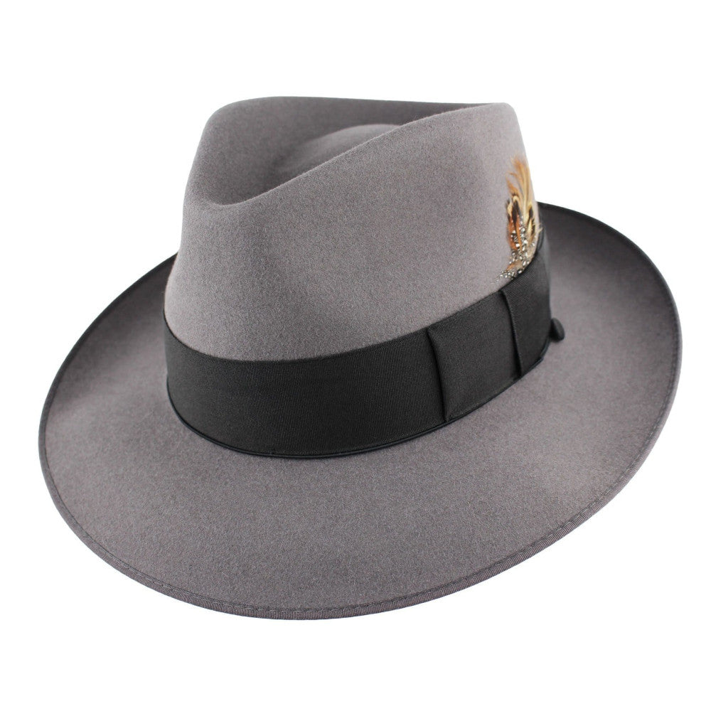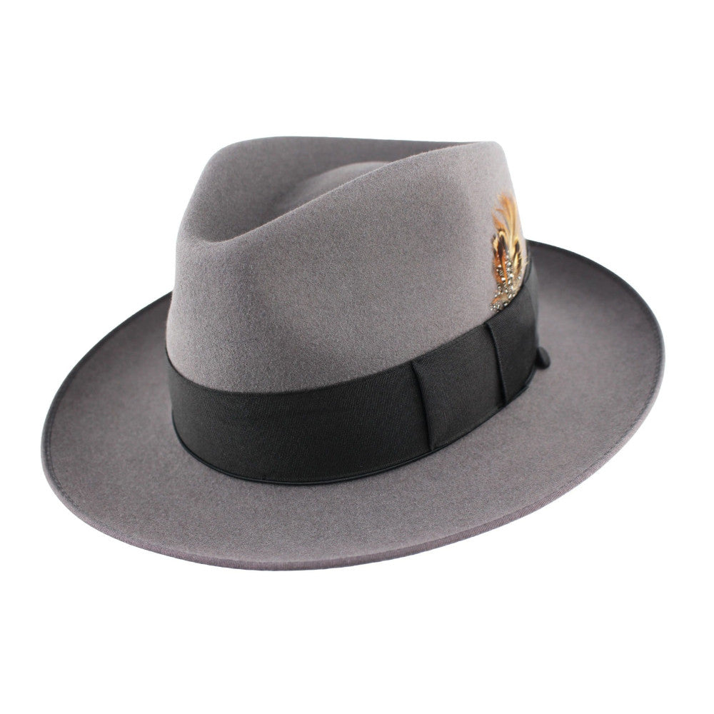 A classic fedora made of genuine fur felt complimented with a sleek grosgrain band and a 2 1/2" brim. Finished with a hand sewn bound edge, and wind-cord for those blustery days. The crown is blocked in the teardrop shape for those seeking a lower profile.100% Fur Felt