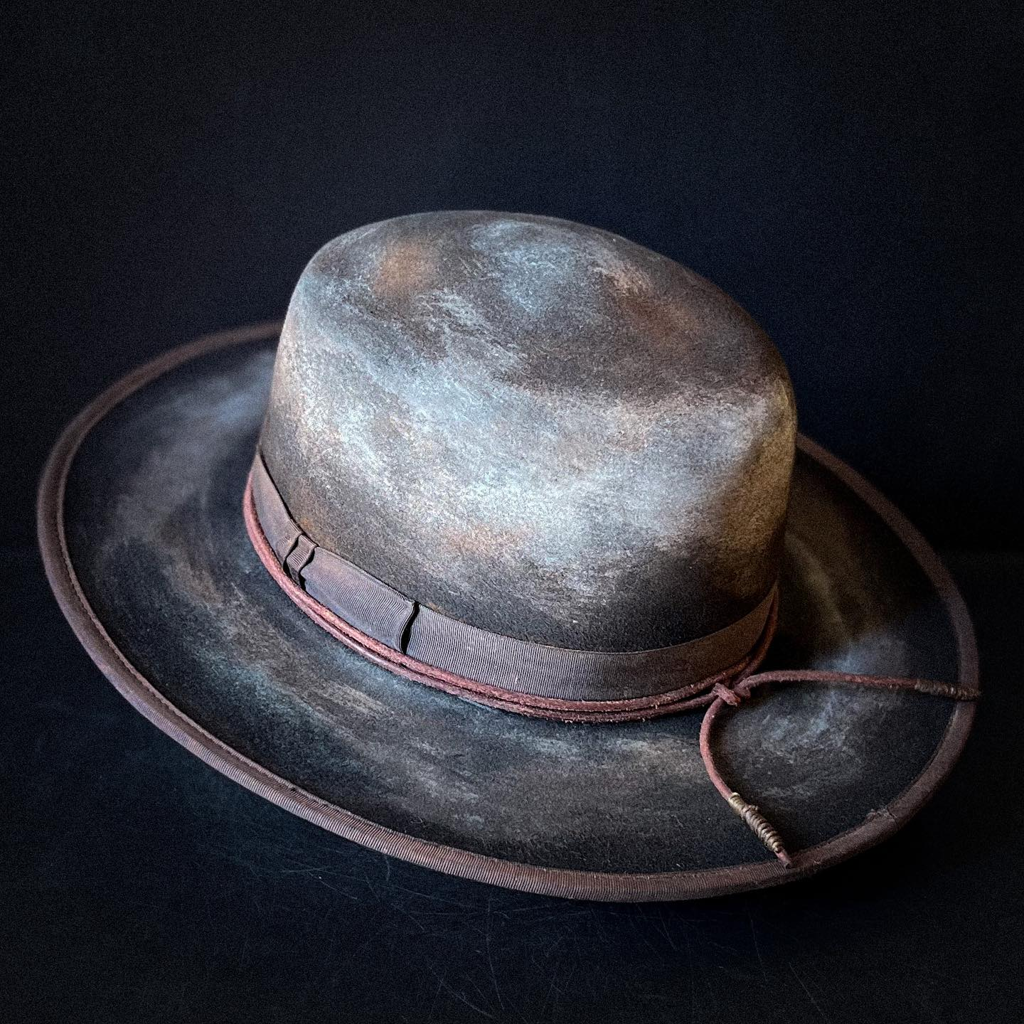 The “Dodge City Devil” is a heavily distressed hat. Made from a beaver/rabbit fur blend. Western weight which is a heavier style of felt. Quality fur! Classic Western design.