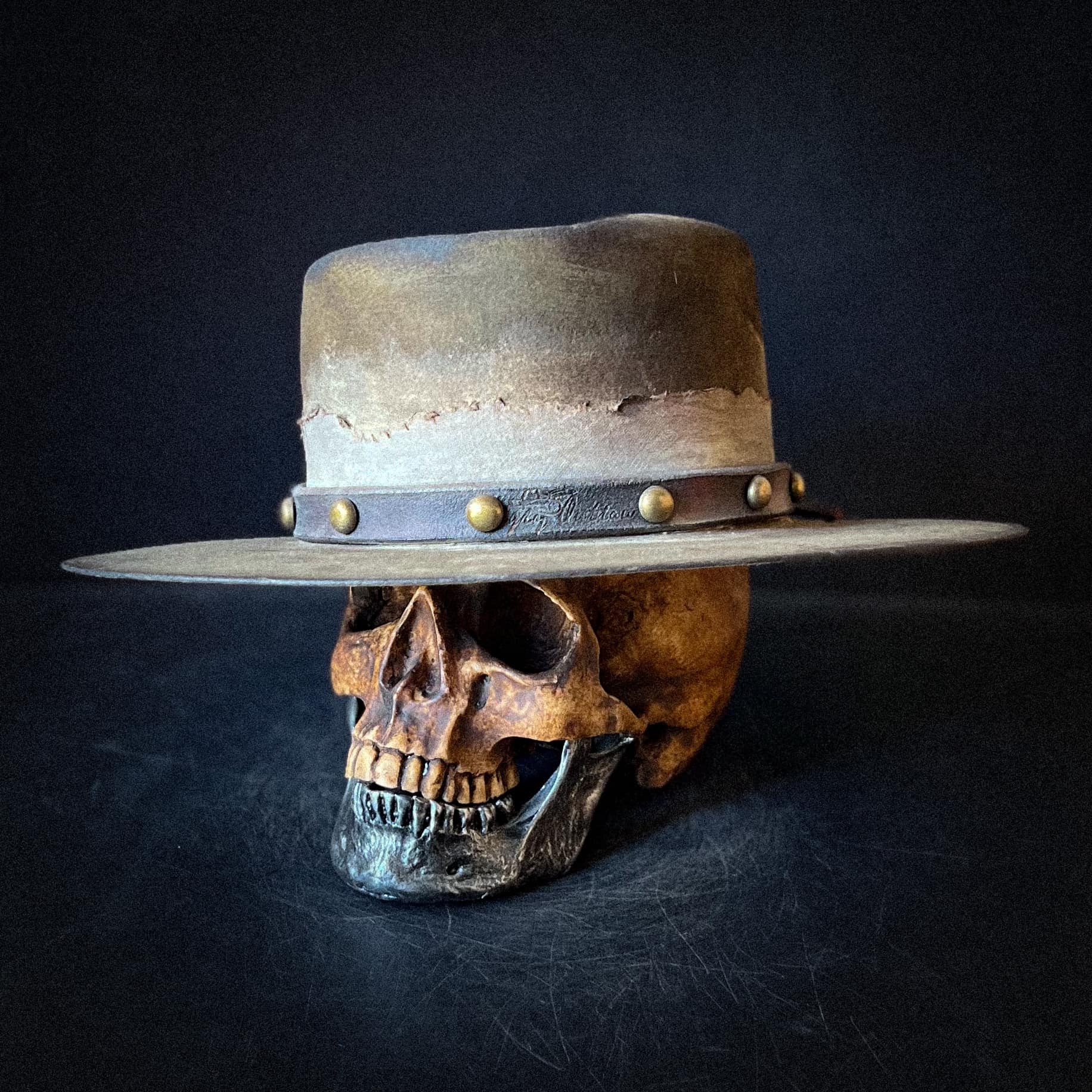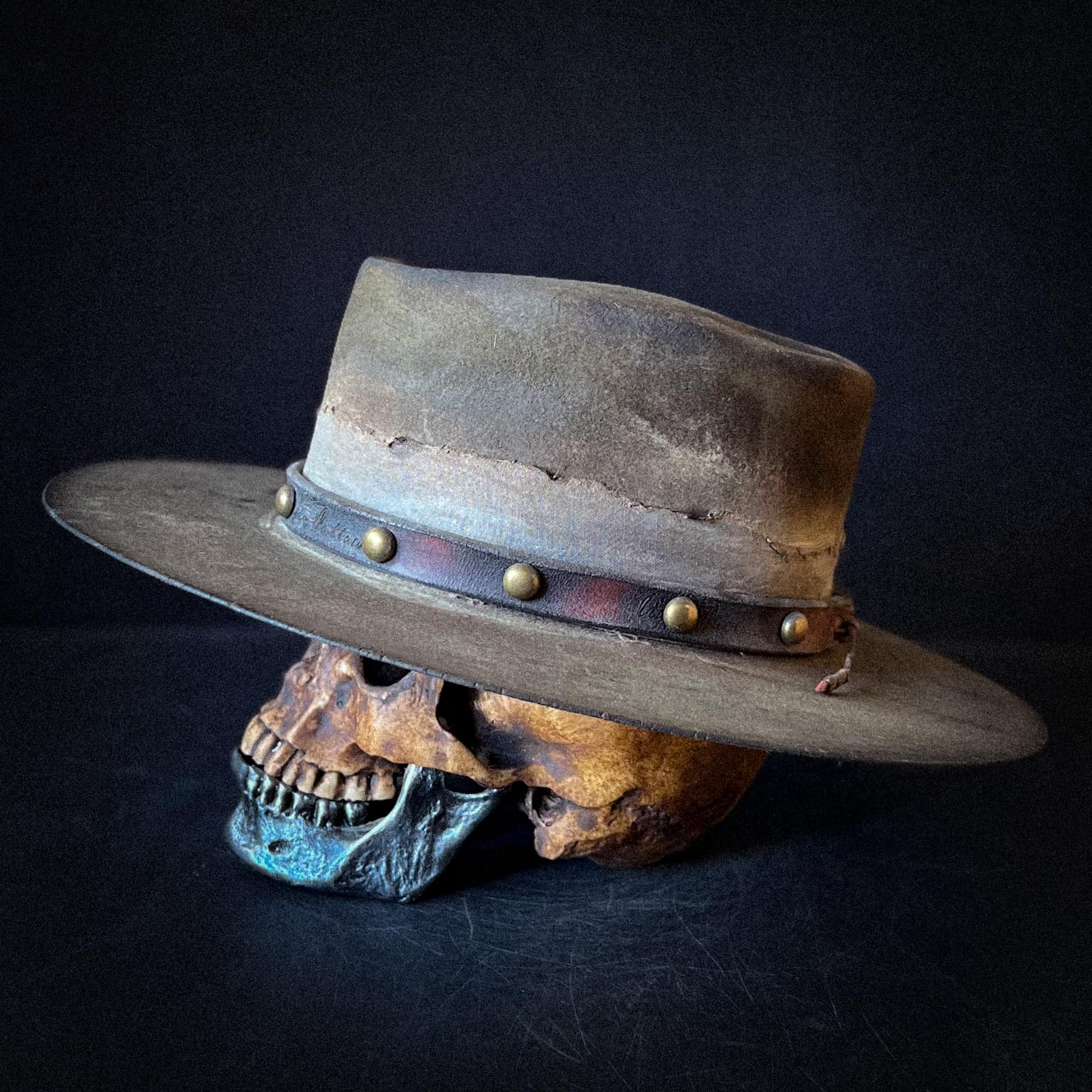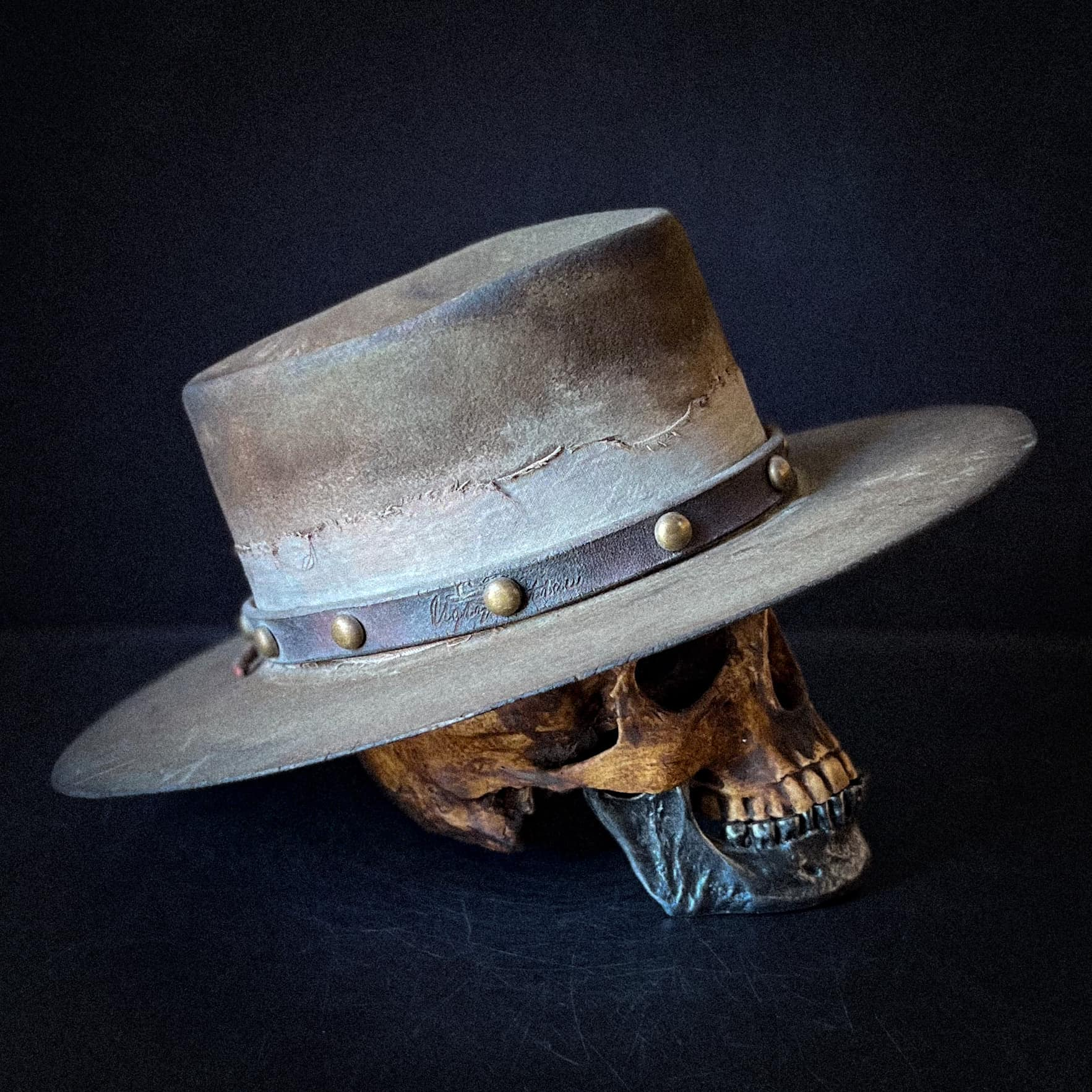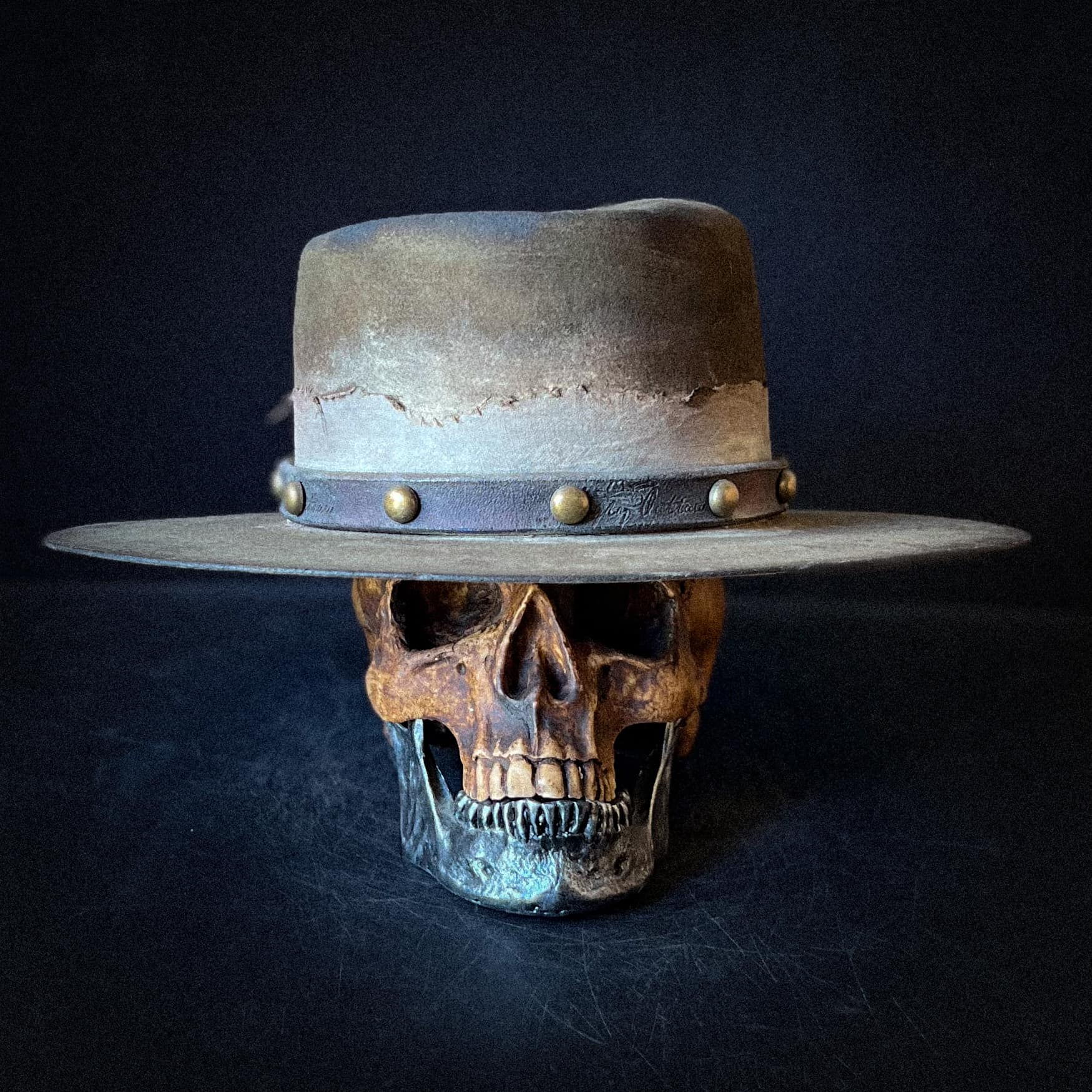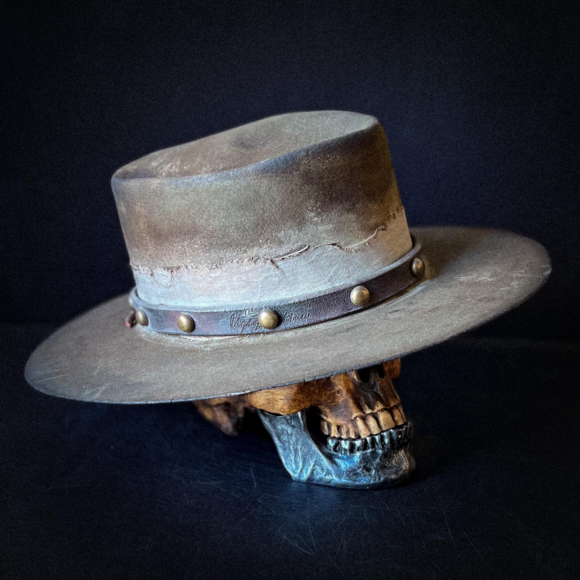 The “Rover” from RockHatter is a heavily distressed hat made of a beaver/rabbit fur blend. Dress weight, which means a bit more lightweight but still quality fu.