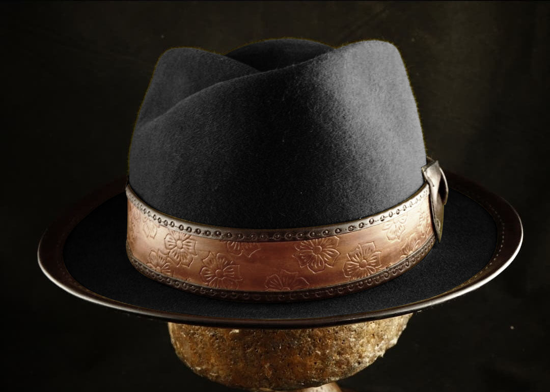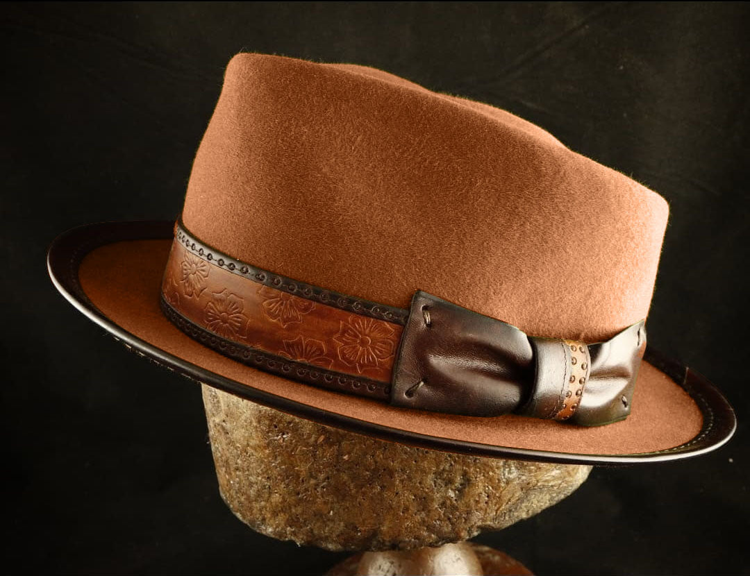 RockHatter‘s “Twisted Pinch Fedora” hat in 100% wool felt adorned with Genuine leather hat strap bow and featur a Tres Duece pinch and leather bound brim.