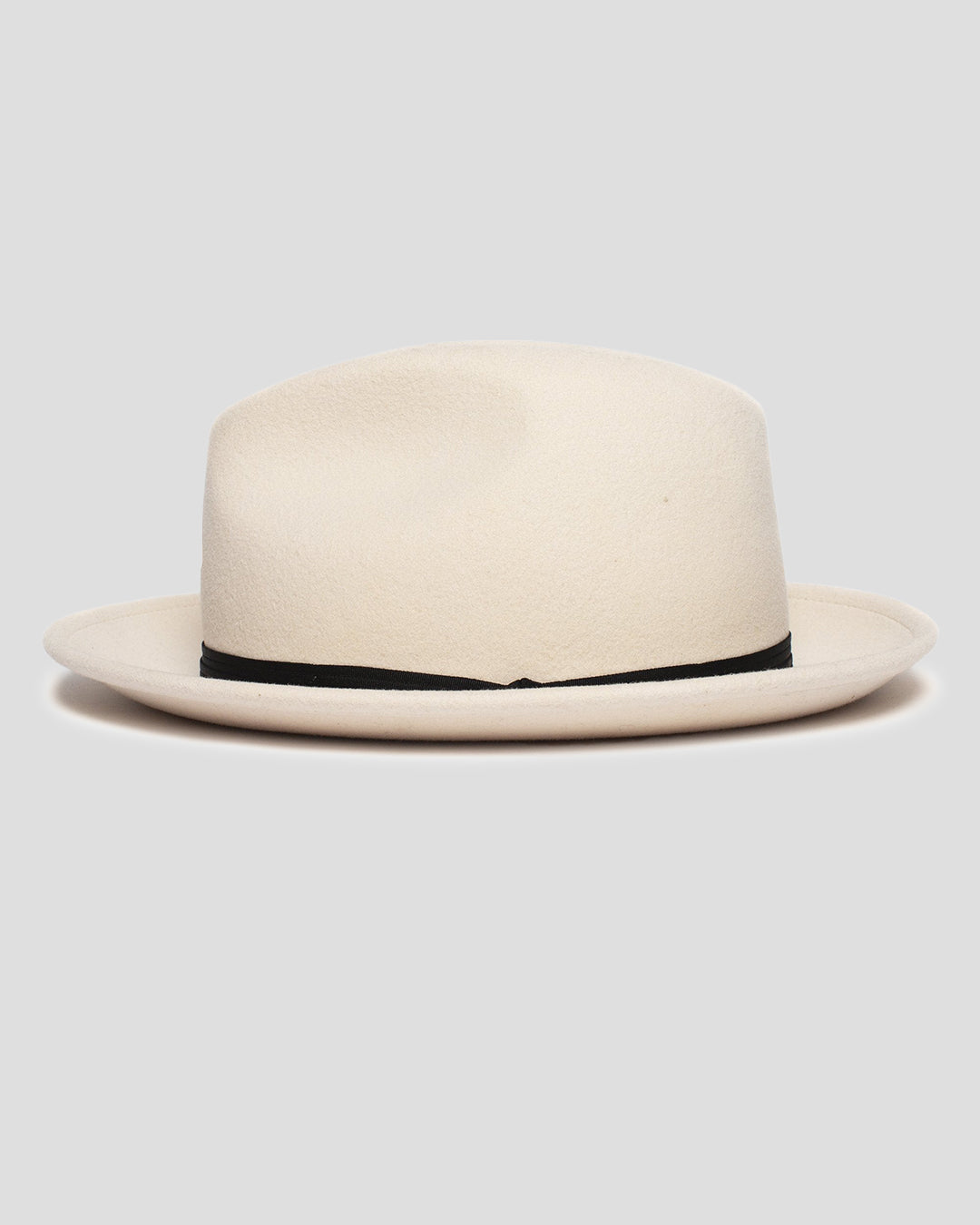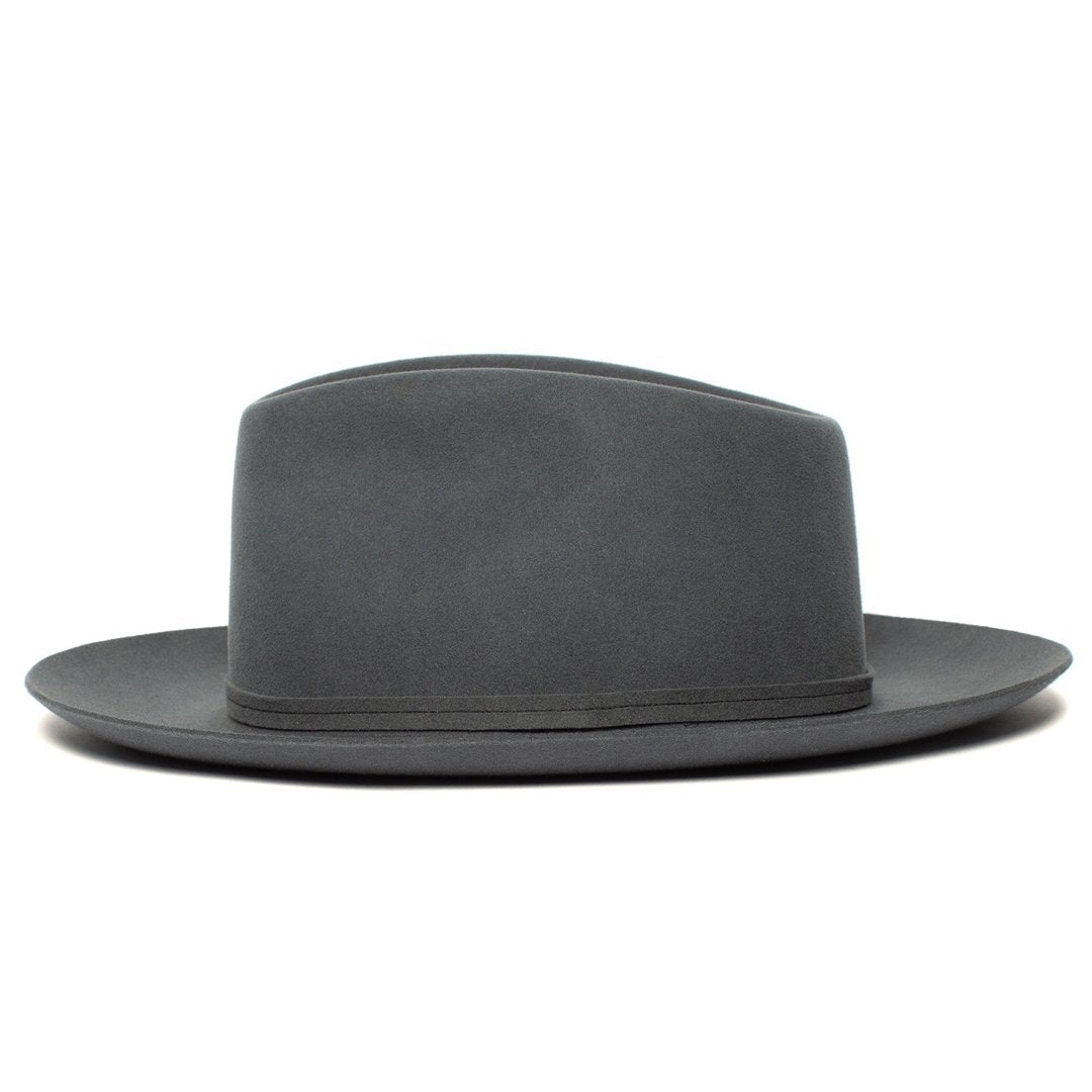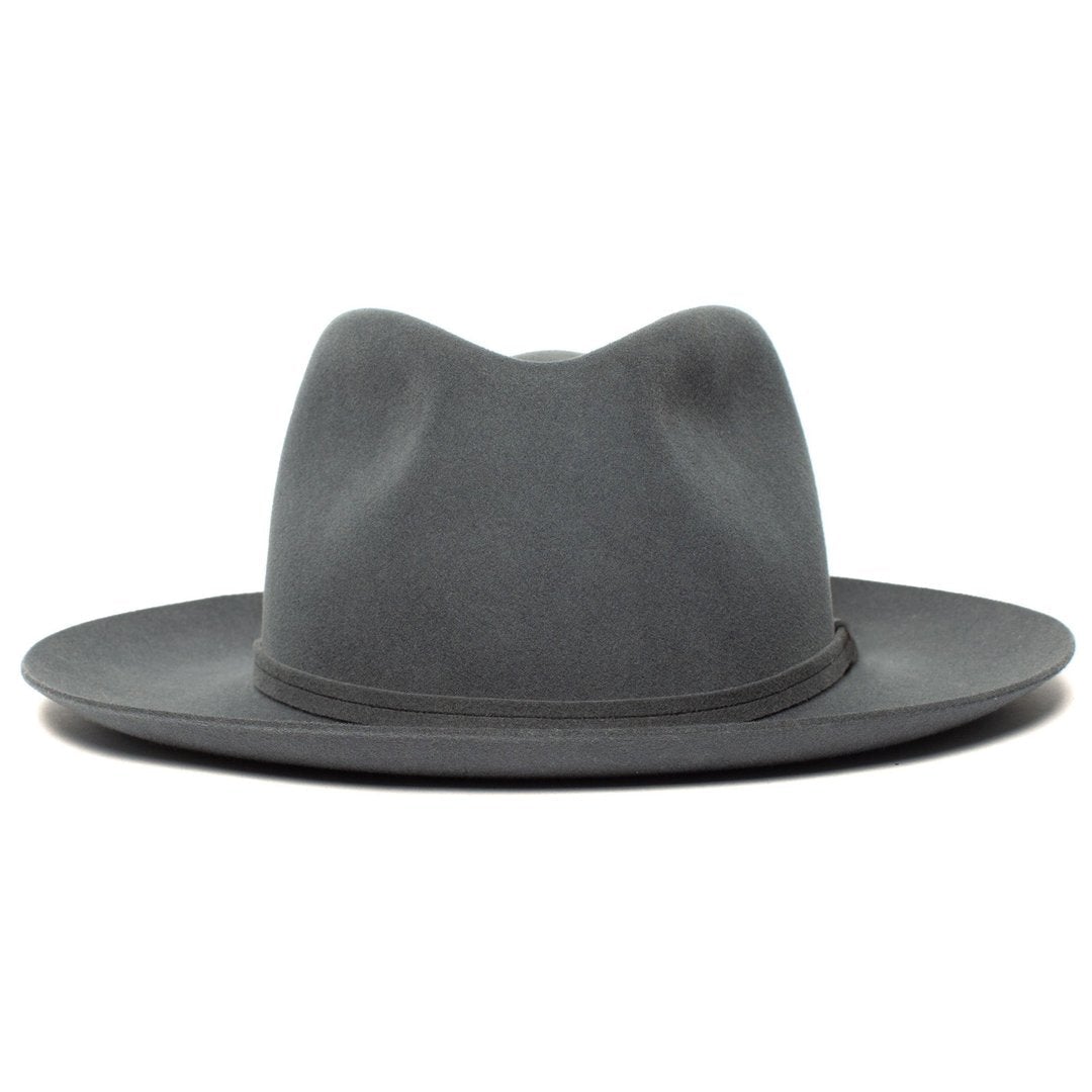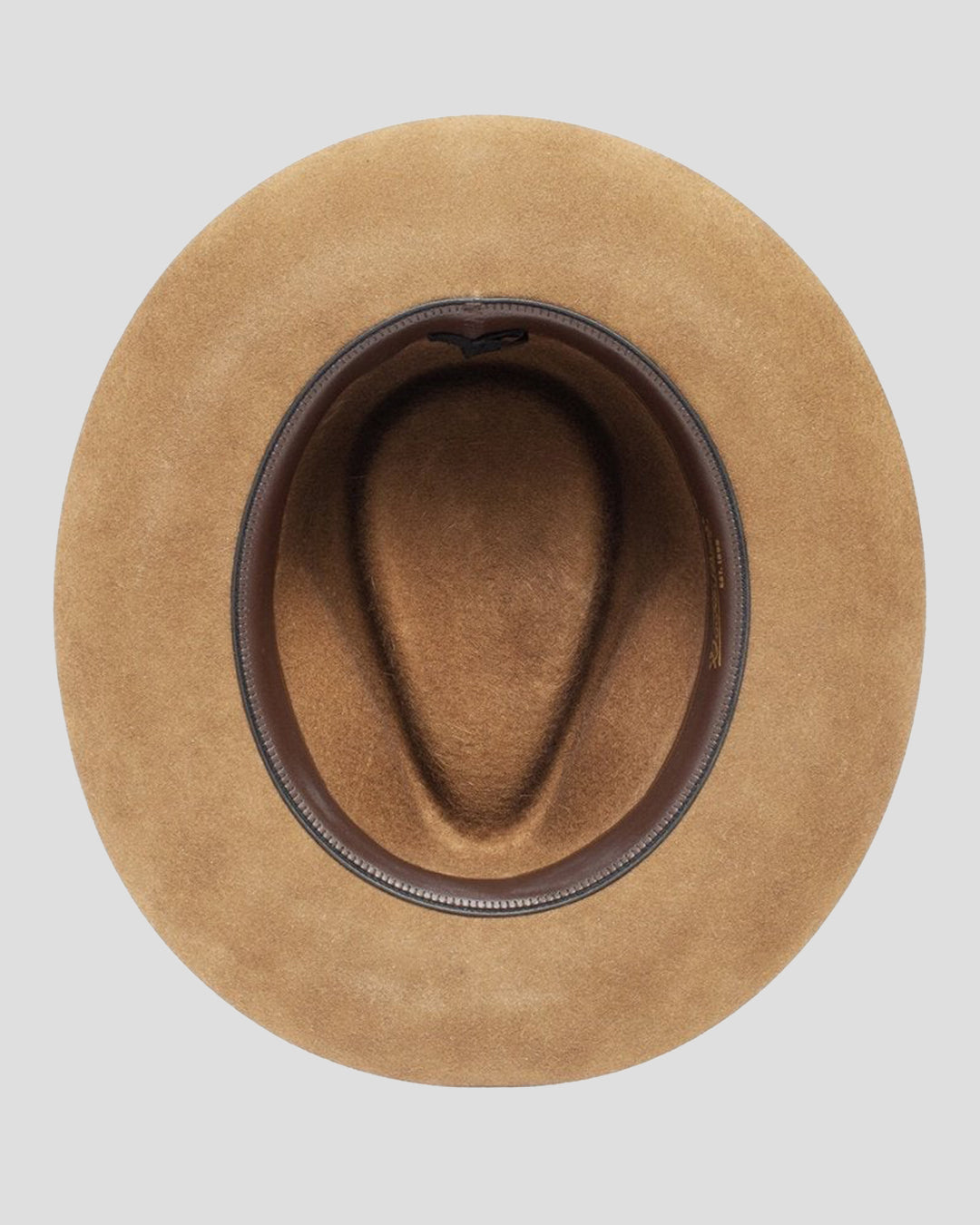 Night Hawk is a shallow depth teardrop crown fedora built on [BLOCK No.18] with a wide snap brim, medium stiffness, and a smooth finish. This all season hat features a 4” teardrop crown, 2 3/4” raw edge snap brim, a self-felt hat band with a genuine leather sweatband.