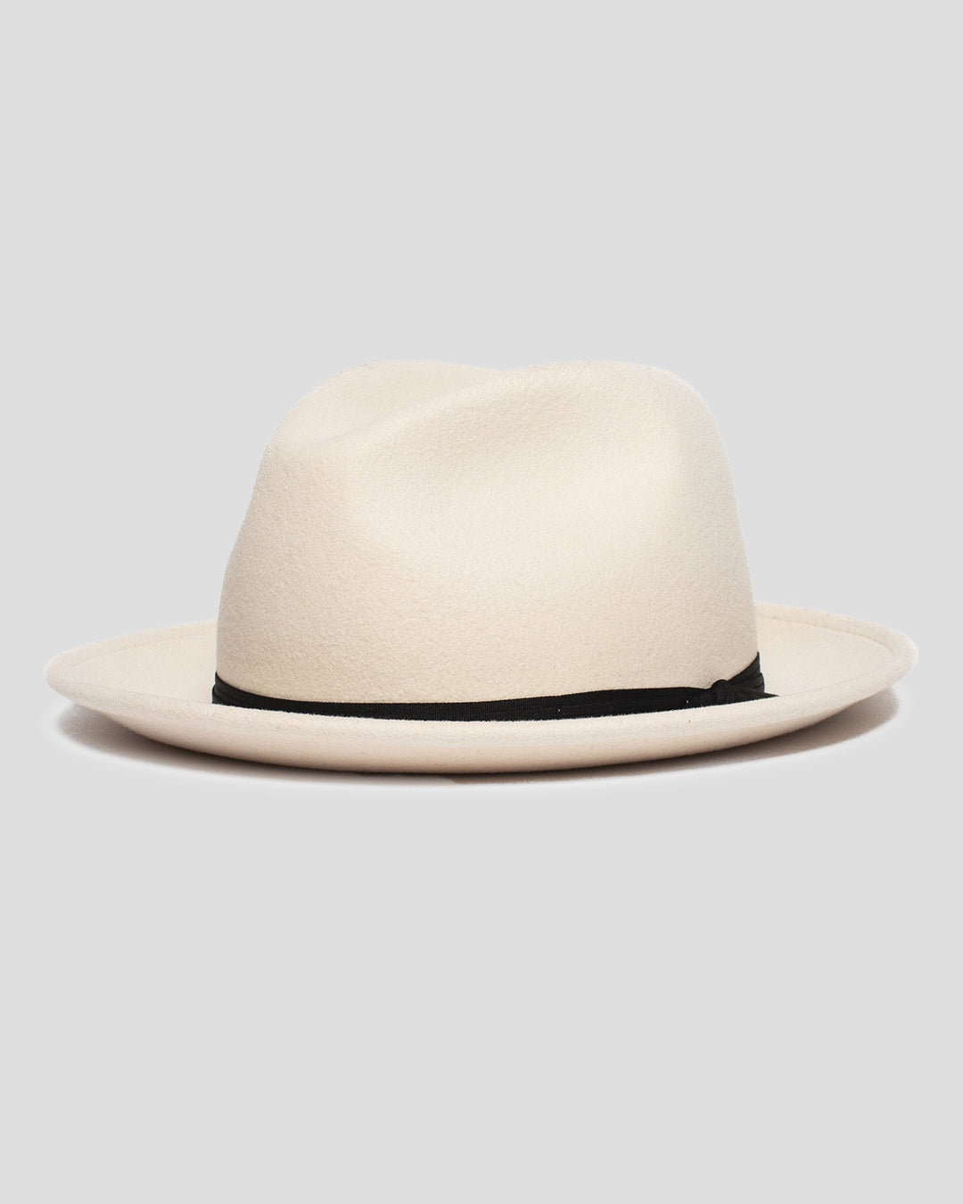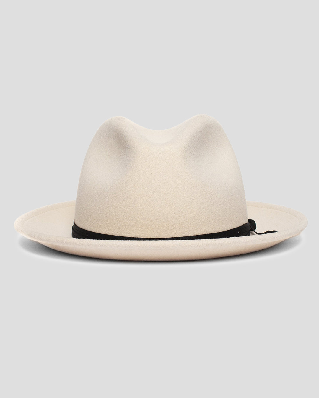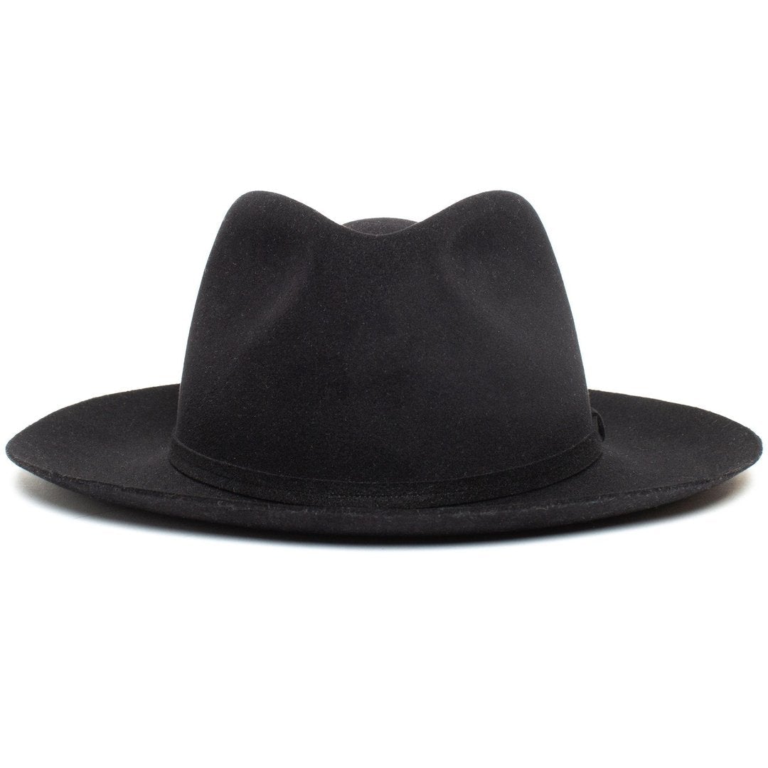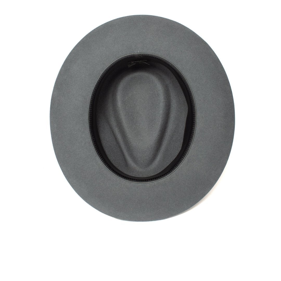 Night Hawk is a shallow depth teardrop crown fedora built on [BLOCK No.18] with a wide snap brim, medium stiffness, and a smooth finish. This all season hat features a 4” teardrop crown, 2 3/4” raw edge snap brim, a self-felt hat band with a genuine leather sweatband.