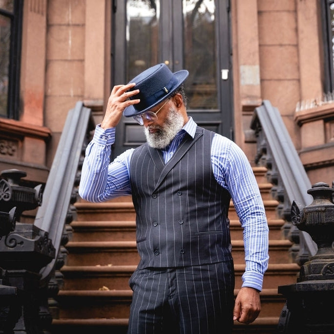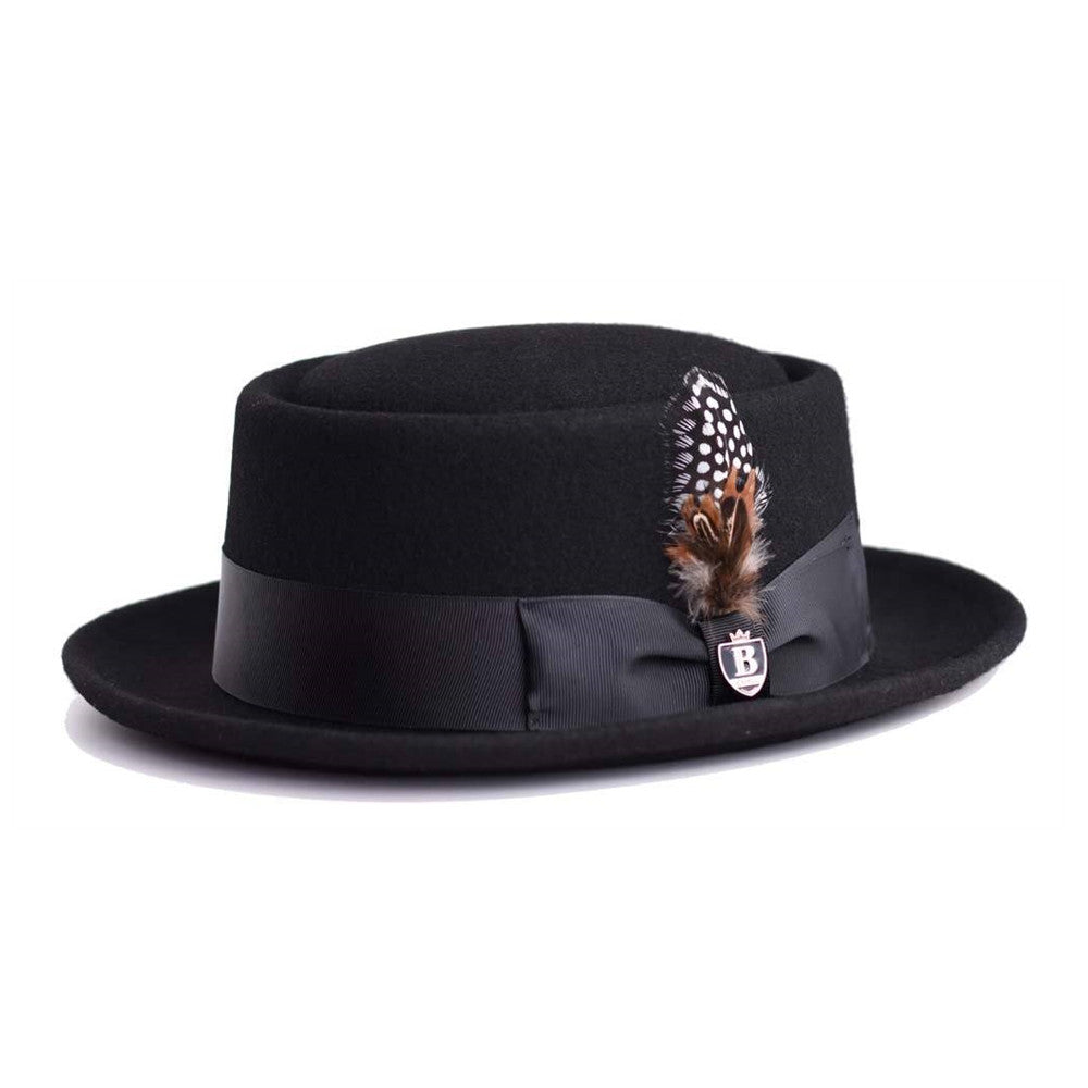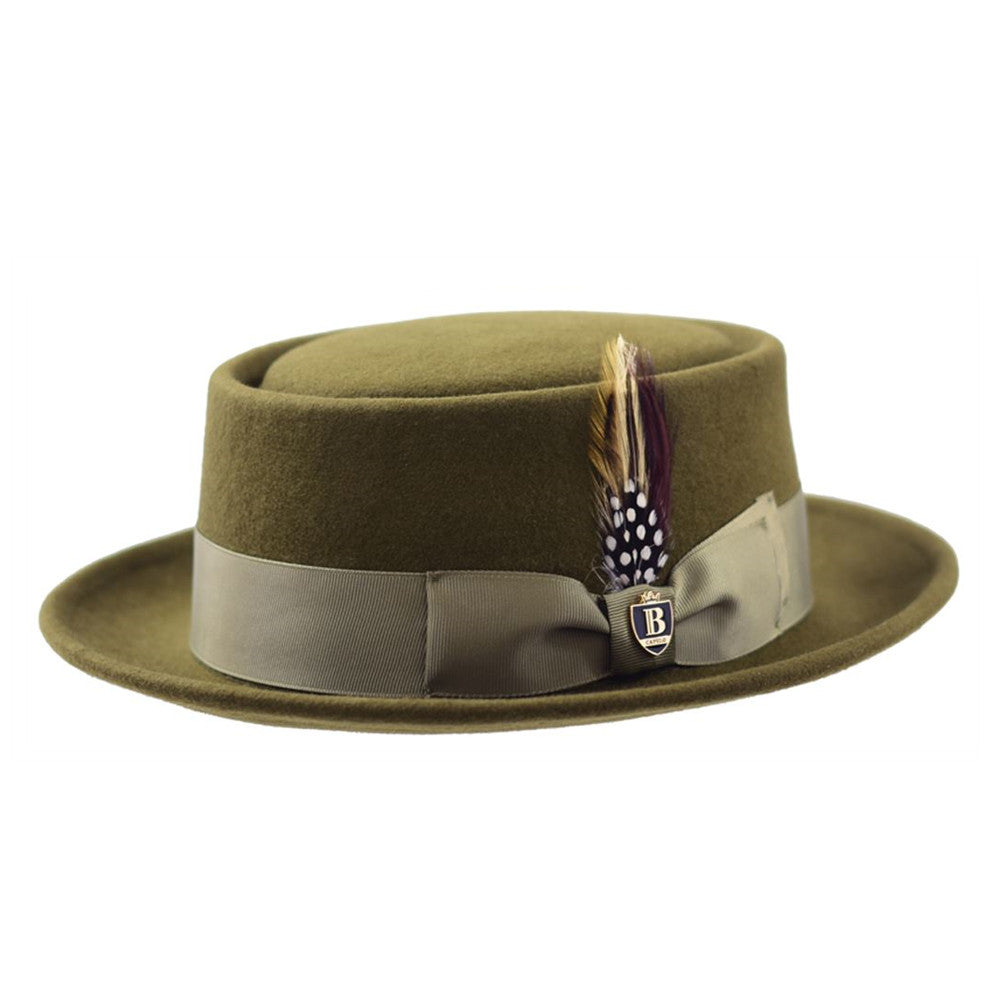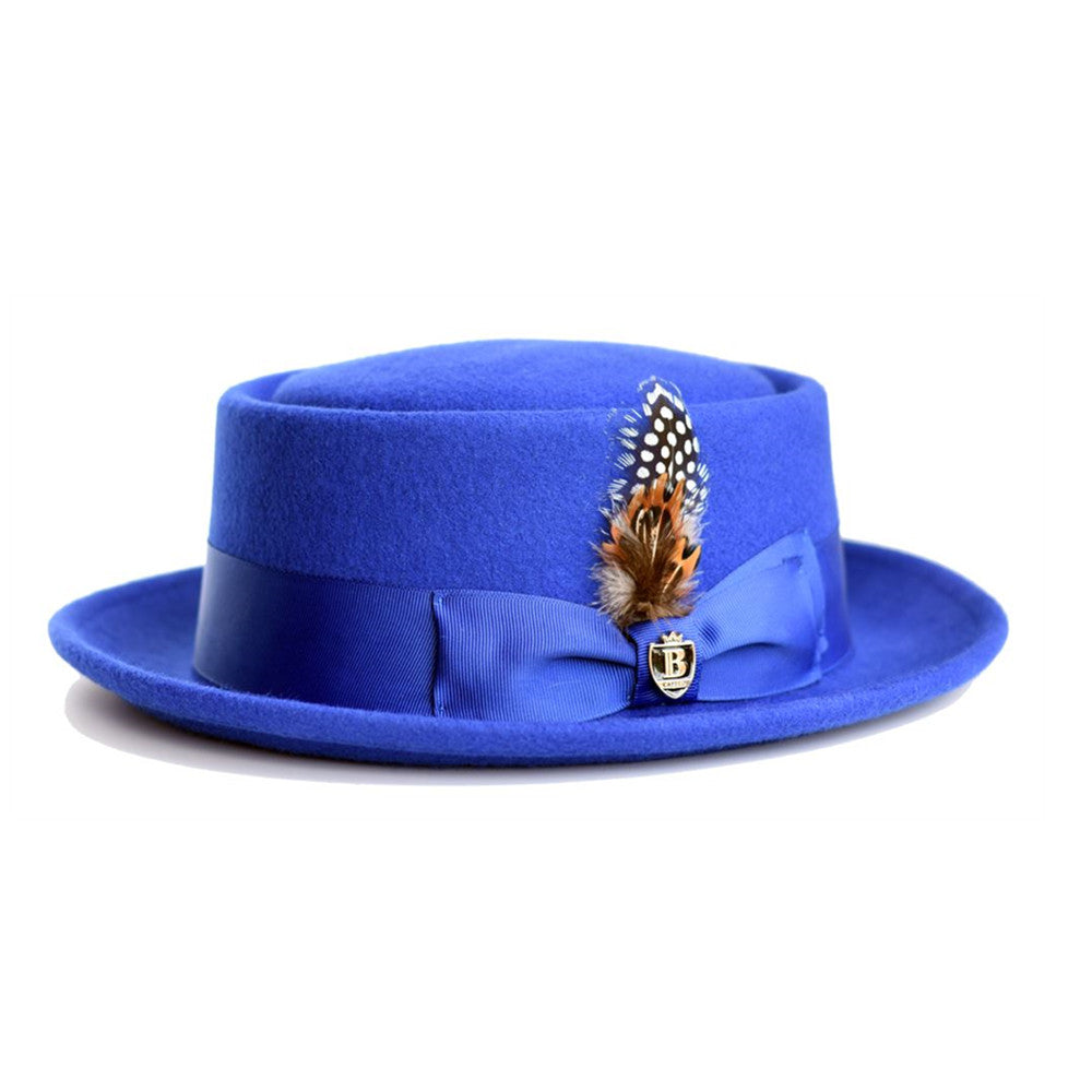 The wool pork pie is made of 100% wool felt, providing a smooth and supple feel. This hat is finished with a grosgrain hat band and decorative feather accent.